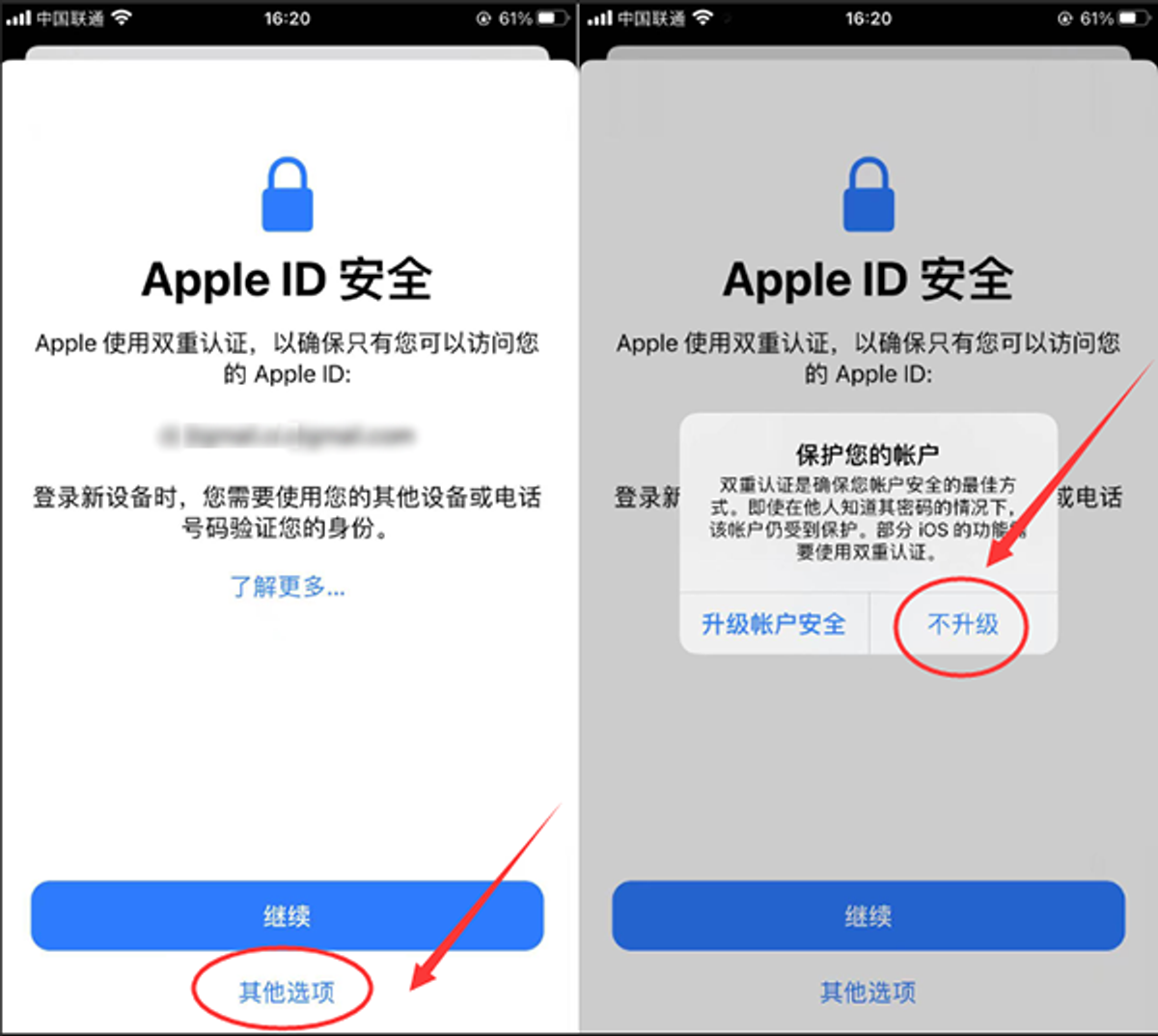 注意有些手机会提示需要回答安全问题,Apple ID安全等 选择 其他选项 点击 不升级